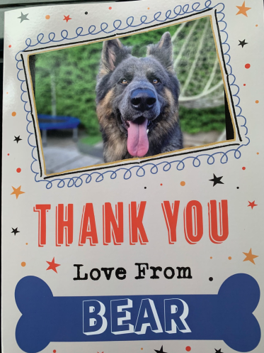 The following thank you card relates to Bear's serious accident which resulted in life threatening damage to his lung.